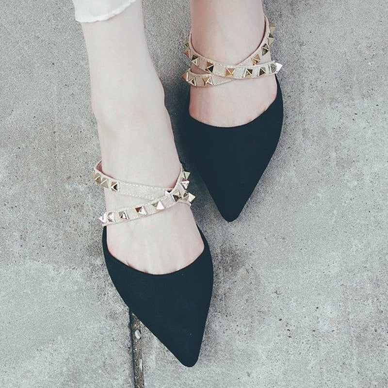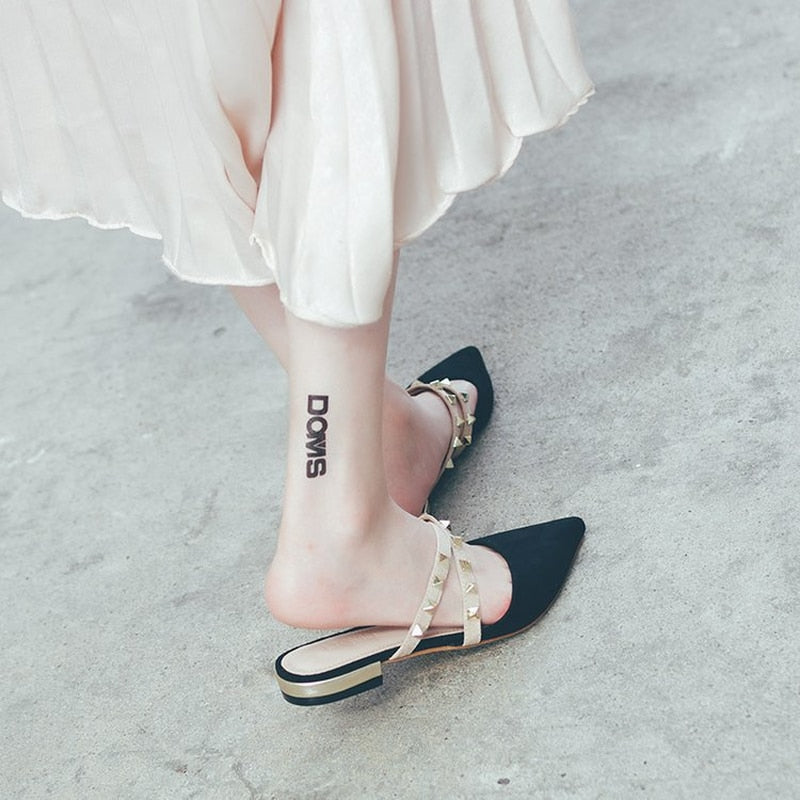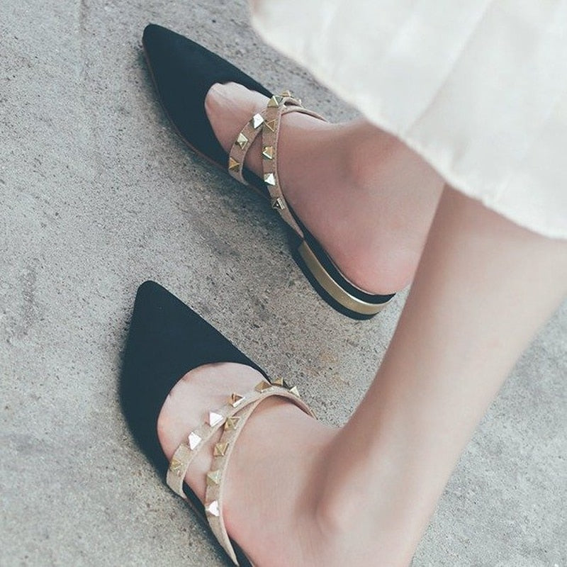Retro Chic Cross Tie Flock Rivet Pointed Toe Square Heels Women Mules Shoes