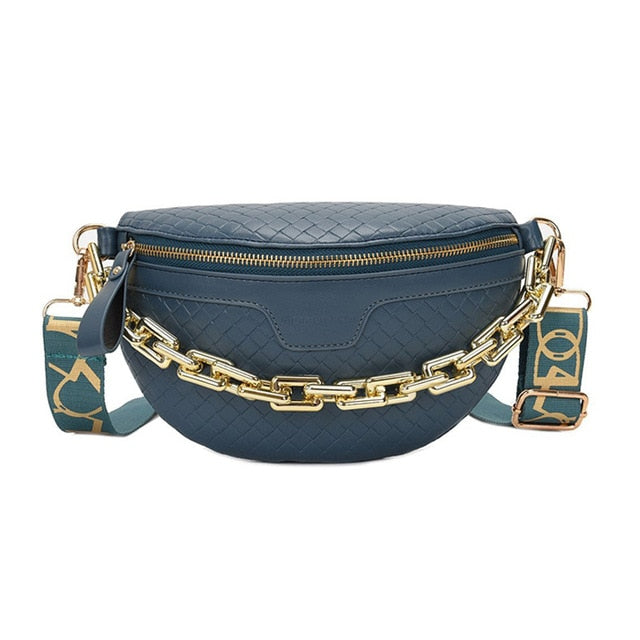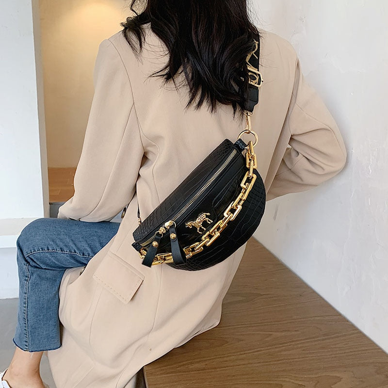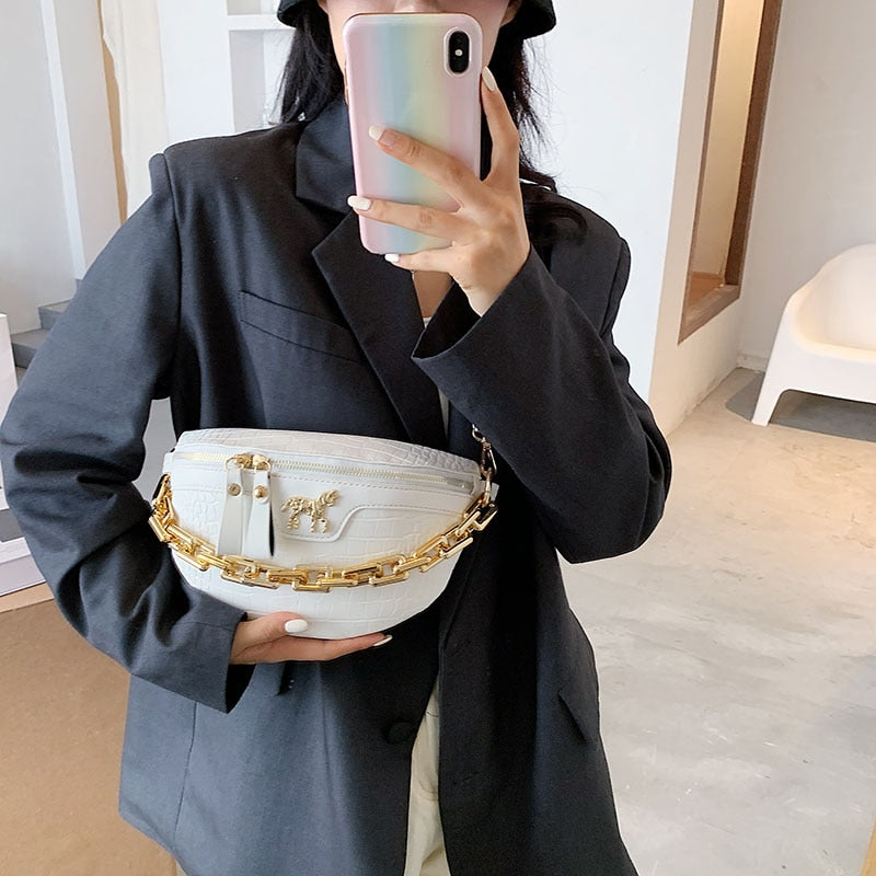 Solid Polyester PU Leather Sling Bag with Unicorn Pin Hardware Decoration and Chain Strap