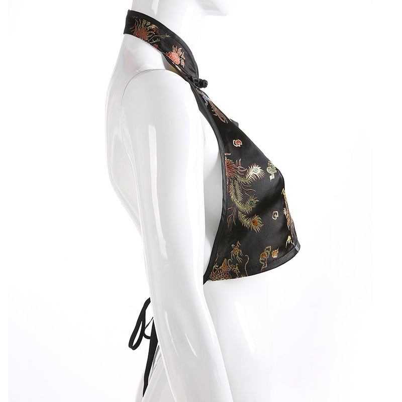 Stand Collared Polyester Tank Top with Dragon Print Pattern and Woven Fabric Type