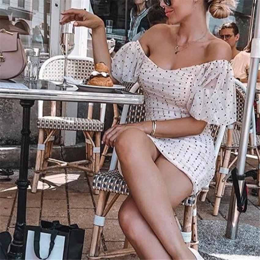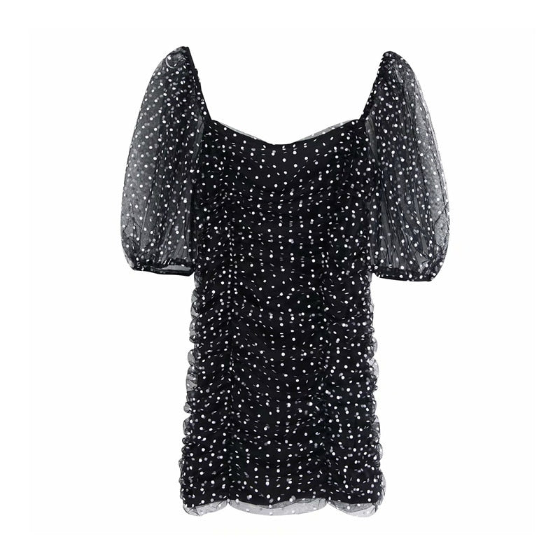 Slim Fit Elegant V- Neck Polka Dot Puff Sleeve Women Mini Dress