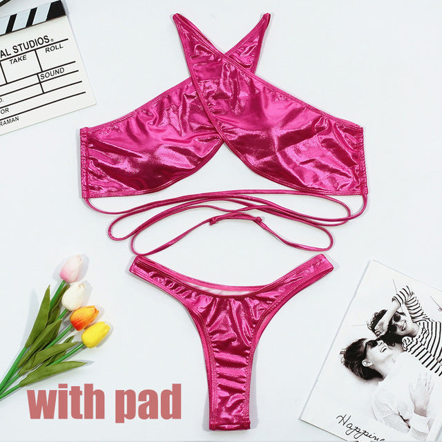 Animal Patterned Polyester Spandex Bikini with Cross Halter Top Style
