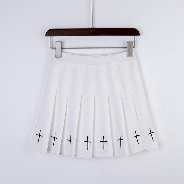 Solid Pleated Cotton Polyester Mini Skirt with Cross Print Decoration