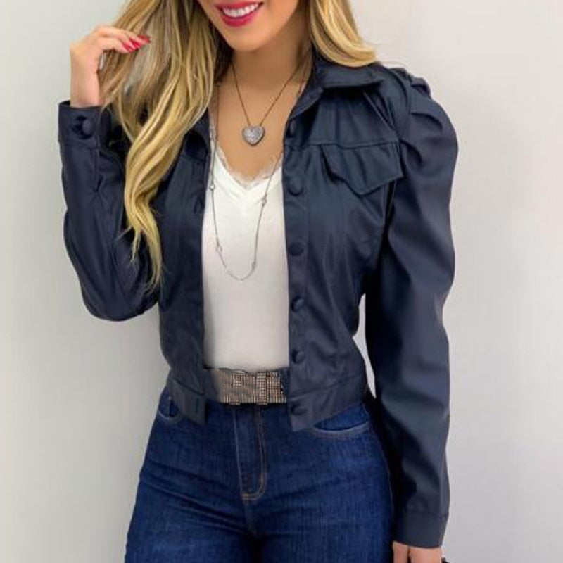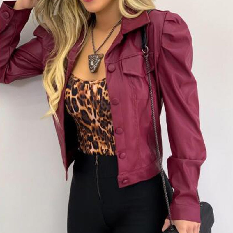Faux Leather Jacket with Single Breasted Closure, Button Decoration. Puff Sleeve, and Turn-Down Collar
