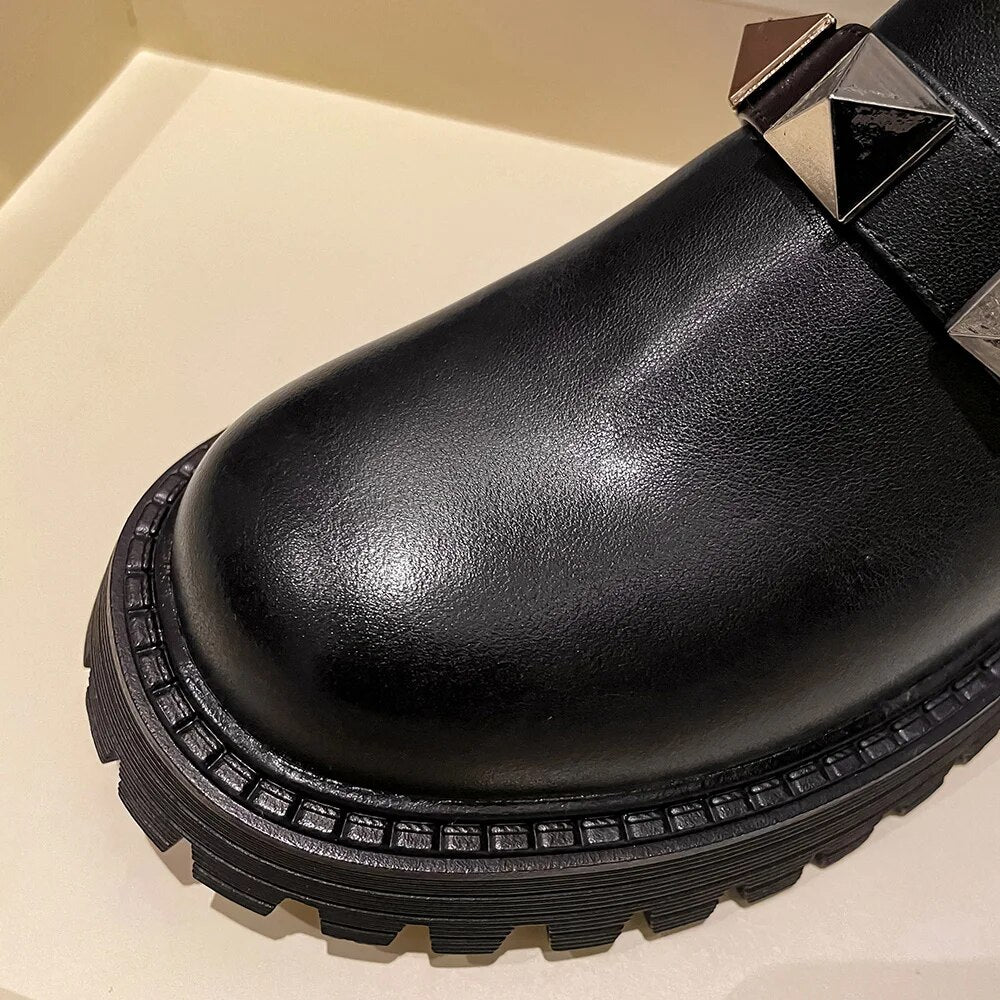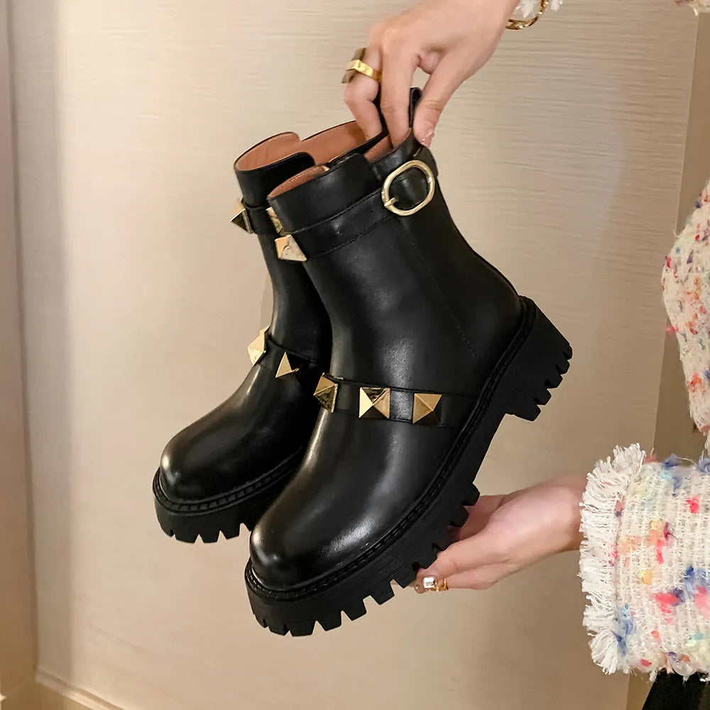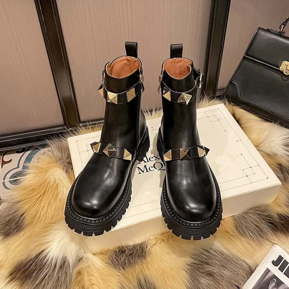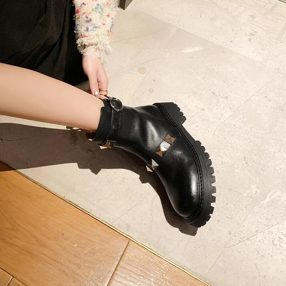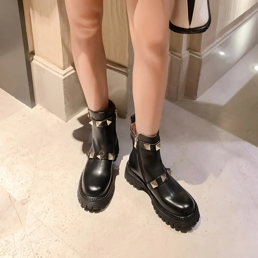 Stylish and elegant, these Time To Step Out Boots feature genuine leather, rivet decoration, and a sleek black color. The perfect ankle-high boots for any occasion.