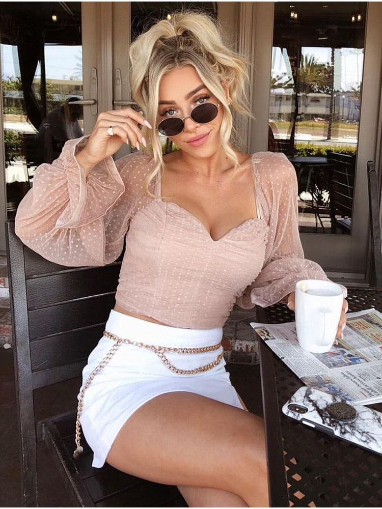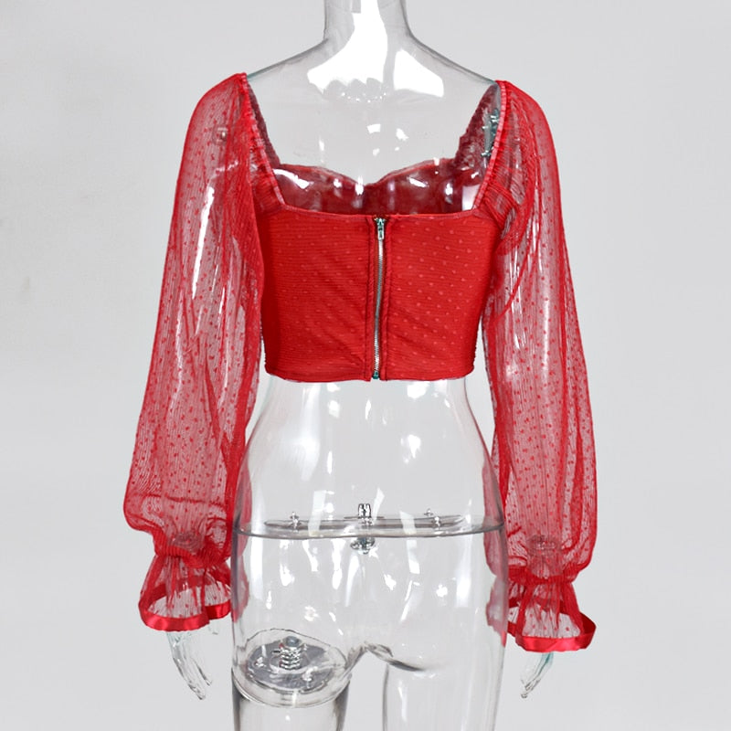 Vintage Pink Sweetheart Neckline Polka Dot Lantern Sleeve Women Ruched Blouse
