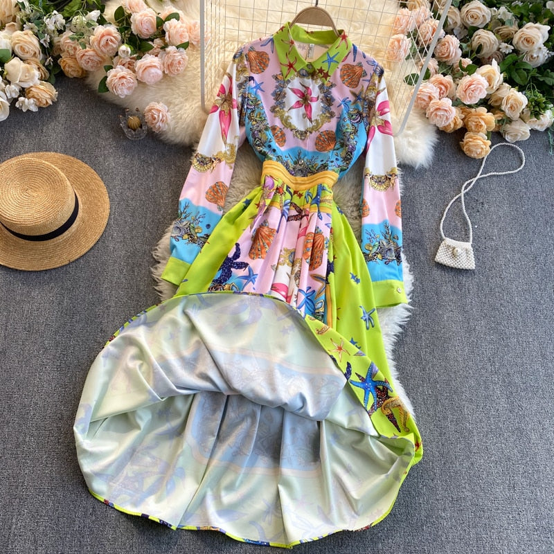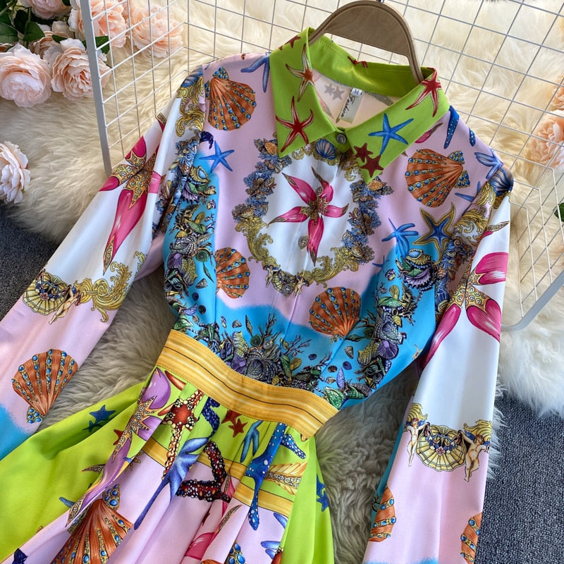Long Sleeve Turn Down Collared Midi Dress with Print Pattern