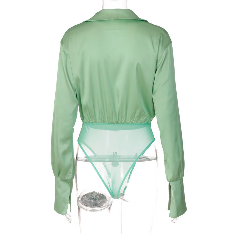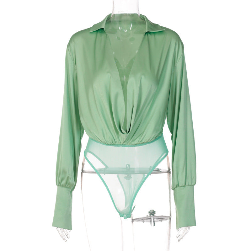 The bodysuit is made of polyester and features a deep v-neck. The sleeve is lantern-style, and the bodysuit is solid. The bodysuit can be worn with a pair of jeans, or with a skirt for a night out.