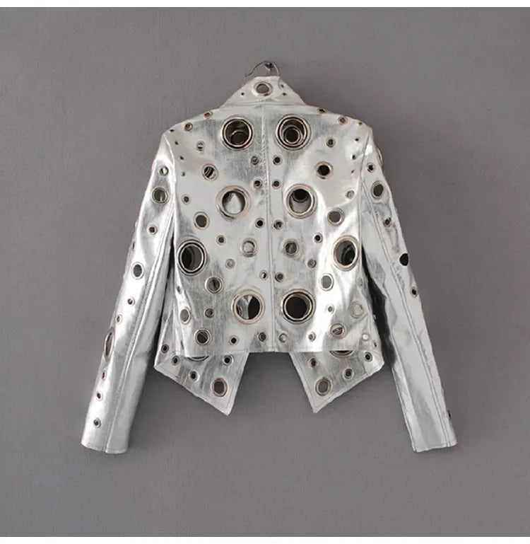This stylish faux leather jacket features a PU construction that is both lightweight and durable. The addition of a hollow-out design and solid color make this jacket a great choice for adding a bold, edgy look to any outfit.